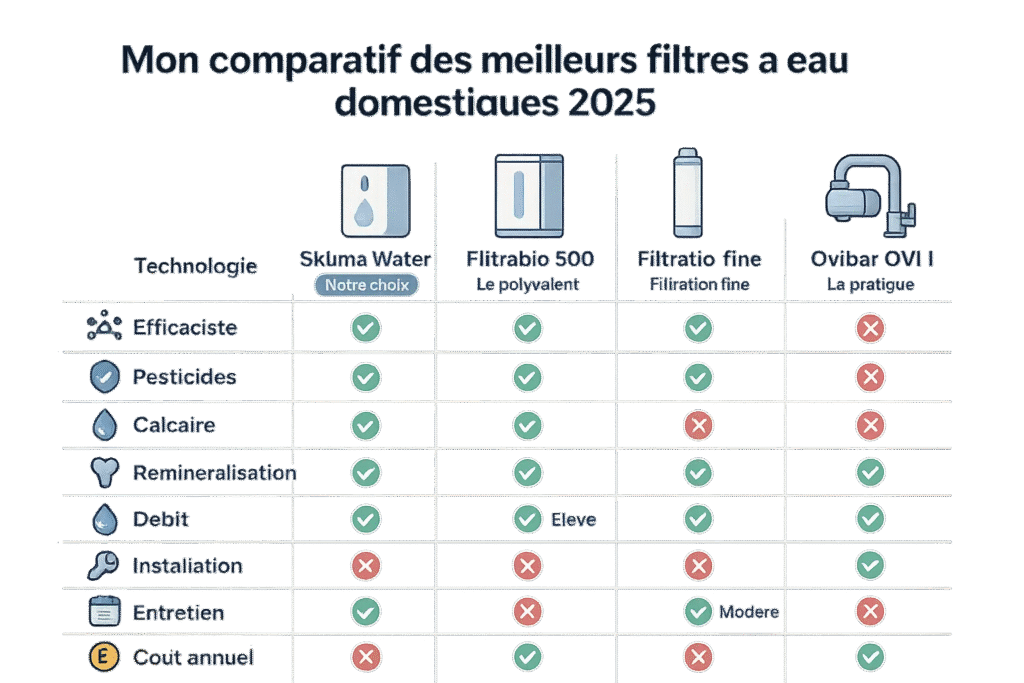 Après plusieurs semaines à analyser les systèmes de filtration disponibles sur le marché, je vous présente mon sélection des meilleurs filtres à eau pour 2025. Mon choix n°1, le Sküma Water, m’a impressionné par son efficacité exceptionnelle à éliminer jusqu’à 99,99 % des contaminants, y compris les redoutés PFAS. Juste derrière, le Filtrabio 500 se distingue par sa capacité à purifier toute l’eau de la maison tout en préservant les minéraux essentiels. Enfin, l’OviBar OVI I propose une solution innovante pour accéder à de l’eau filtrée instantanée à la température souhaitée. Explorez avec moi les spécificités de ces trois références et découvrez pourquoi chacun d’eux mérite sa place dans votre cuisine !