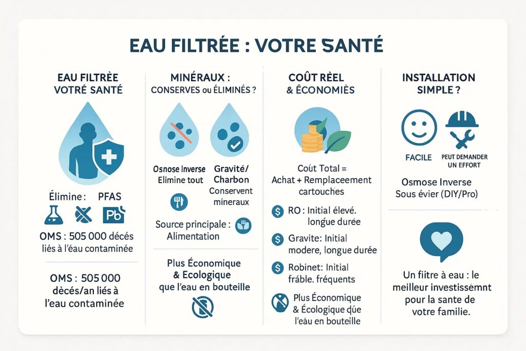 - Carafe filtrante : Améliore principalement le goût (chlore), mais son efficacité sur la santé est très limitée.
