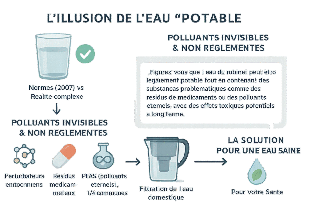Ce que vous ignorez peut-être, c’est que la réglementation est en retard sur les connaissances scientifiques. Plus de 100 000 molécules présentes dans notre environnement sont suspectes d’effets toxiques à long terme. Elles peuvent se retrouver dans l’eau que vous buvez. Selon une enquête récente, 85 % des Français lui font confiance, mais force est de constater que cette confiance ne correspond pas toujours à la réalité.