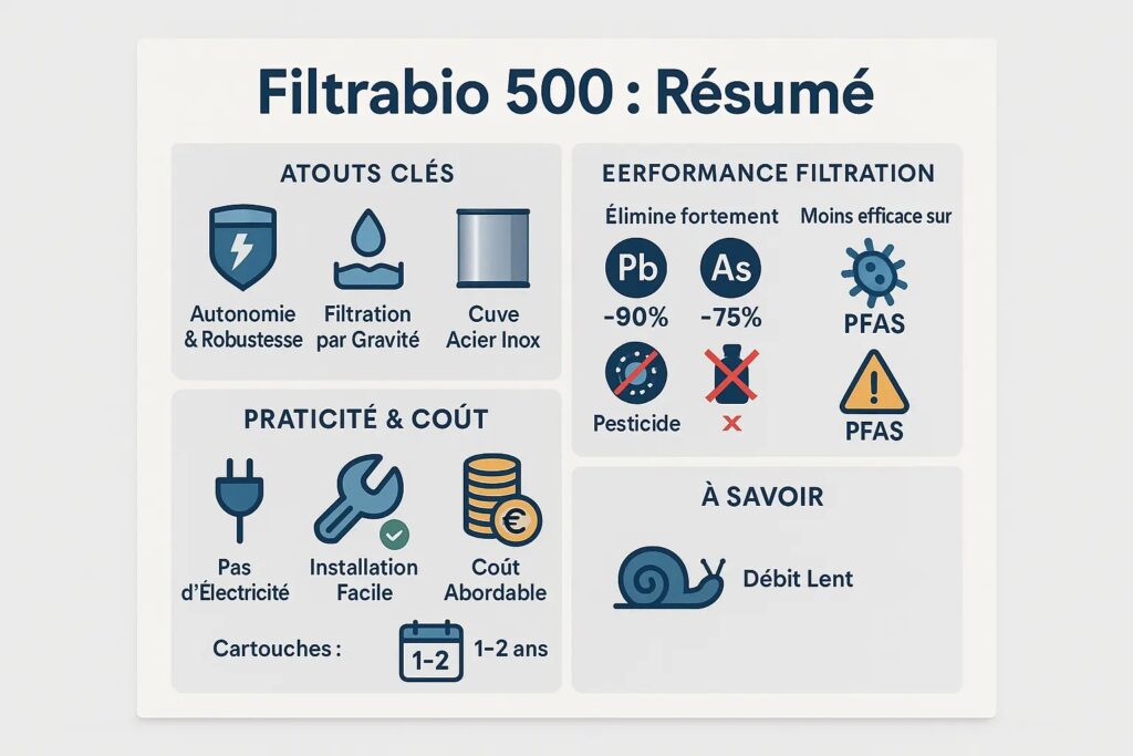 Pour un équilibre entre performance, autonomie et budget, le Filtrabio 500 s’impose. Ce filtre traite 600 000 litres d’eau sur 4 ans, éliminant chlore, métaux lourds et résidus médicamenteux, tout en préservant les minéraux essentiels. Idéal pour toute la famille, il améliore aussi la qualité de l’eau pour la douche ou la cuisine.