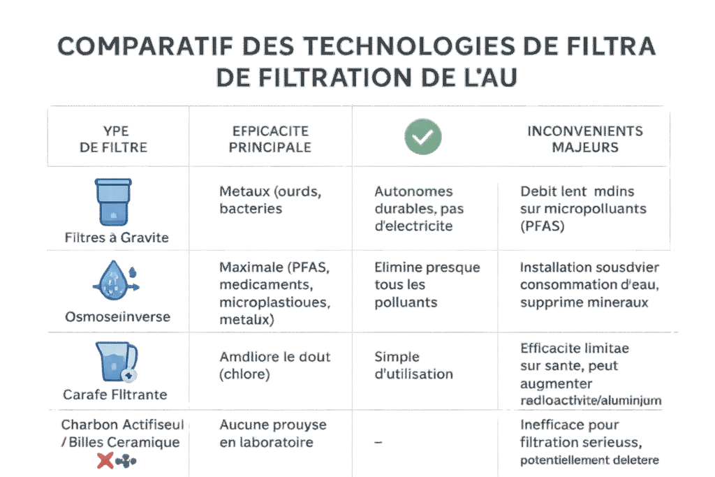 - Charbon actif seul/Billes céramique : Aucune efficacité prouvée en laboratoire, à éviter pour une filtration sérieuse.