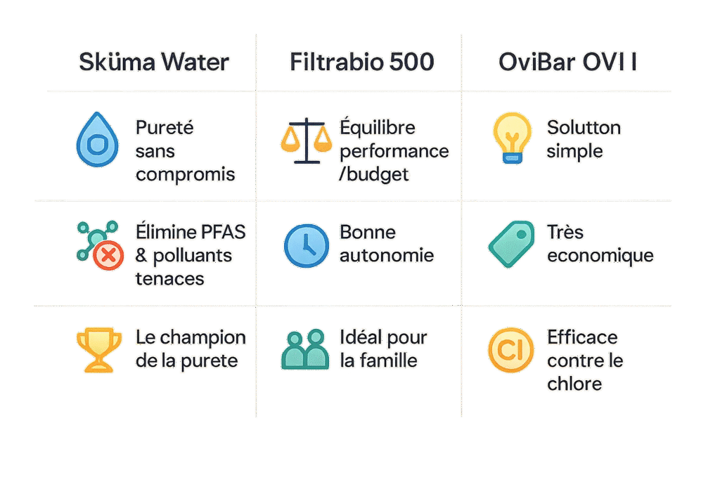 Force est d’admettre que le choix du filtre dépend de vos besoins : Sküma Water pour la pureté totale (PFAS), Filtrabio 500 pour équilibre performance-qualité, OviBar OVI I contre le chlore. Un choix crucial pour une eau saine. Comme préparer un voyage, une bonne décision garantit une expérience inégalée.