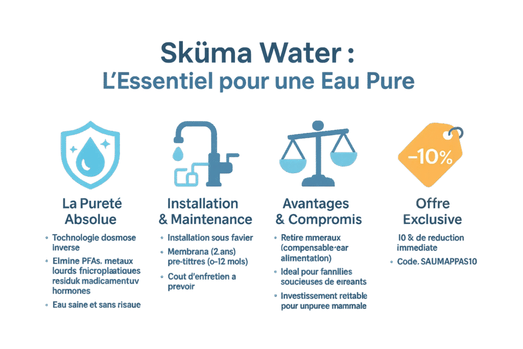Attention toutefois : l’osmose inverse élimine aussi les minéraux essentiels. Je compense cet aspect par une alimentation équilibrée, un compromis acceptable pour une eau pure. Contrairement aux idées reçues, l’eau du robinet en France peut contenir des molécules non réglementées. Sküma Water est la solution la plus fiable pour une purification optimale.