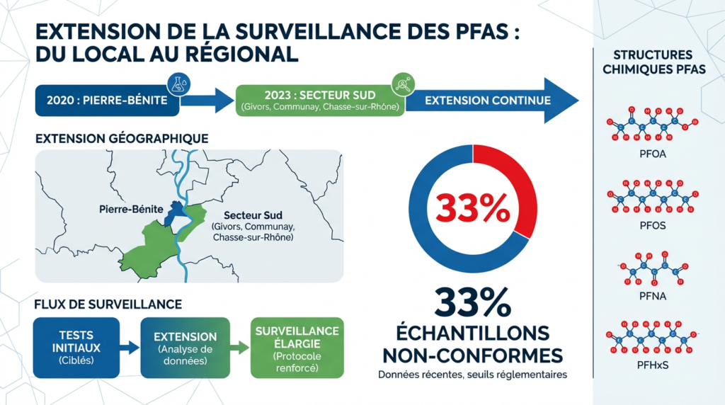 Face à l’ampleur de ce phénomène, l’ARS a élargit ses tests au fur et à mesure que les résultats tombent. Parti de Pierre-Bénite, le périmètre a fini par englober le secteur sud (Givors, Communay, Chasse-sur-Rhône). Un élargissement logique suite aux analyses qui montraient une contamination s’étendant bien plus loin que prévu.
