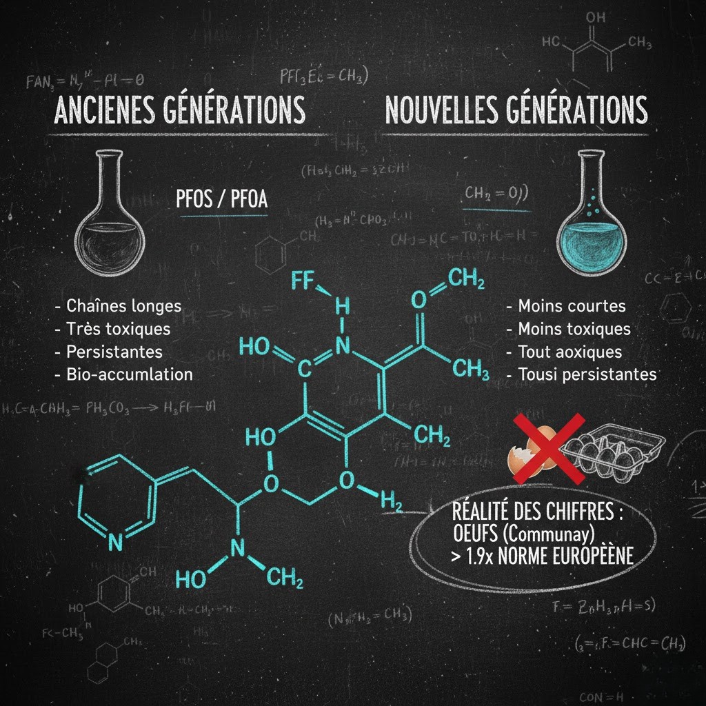 La réglementation actuelle de l’ARS ne surveille que 4 molécules spécifiques (les plus anciennes) dans les aliments : le PFOA, le PFOS, le PFNA et le PFHxS. Or, les analyses détaillées que le collectif s’est procurées révèlent la présence de nombreuses autres molécules (comme le PFDA ou le PFunDA).
